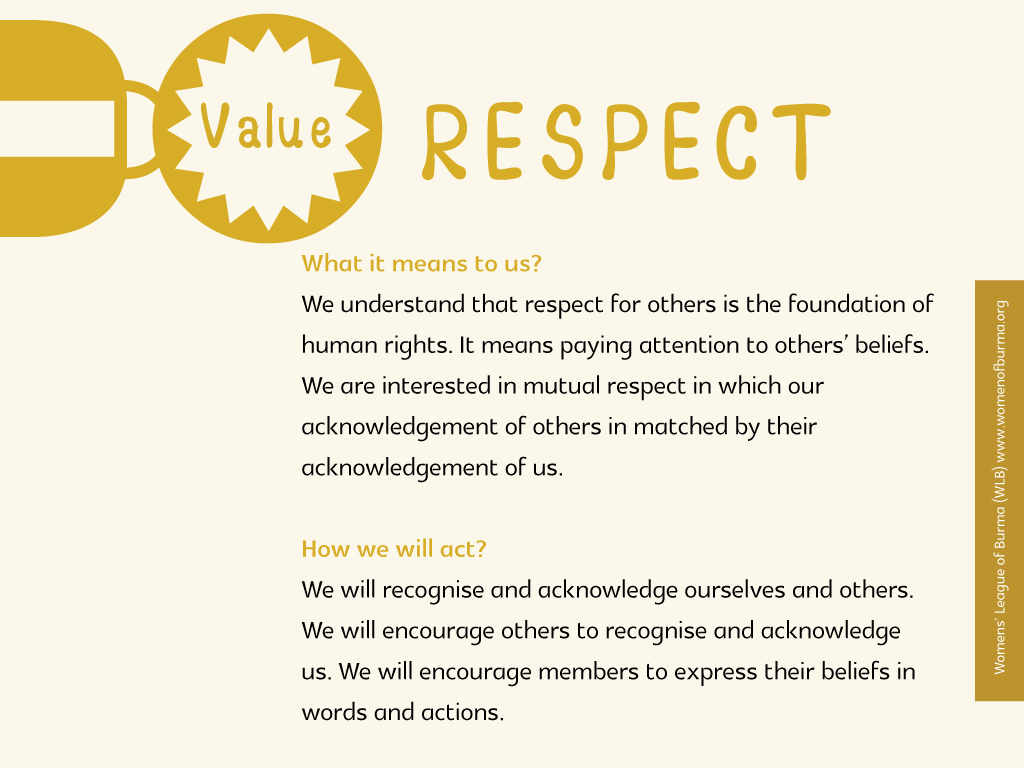 - Understanding that full values are chosen freely, chosen from among alternatives, chosen after due reflection, prized and cherished, publicly affirmed, acted upon, and re part of a pattern that is a repeated action, the Women’s League of Burma has provisionally chosen nine full values to govern its work. These values are: