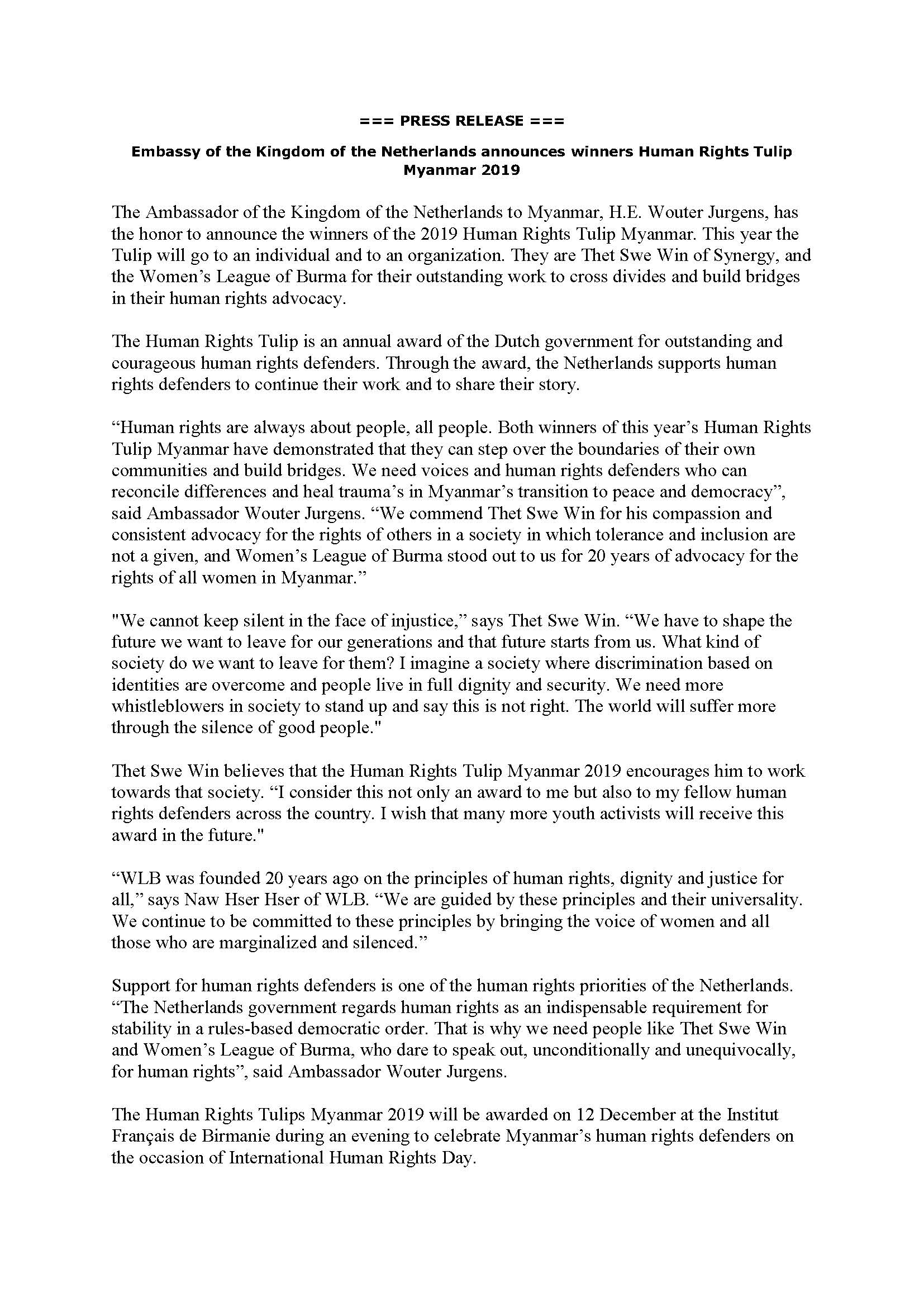 In 2019, the Women’s League of Burma received the Human Rights Tulip Myanmar Award, given by the Embassy of the Kingdom of the Netherlands. The Human Rights Tulip is an annual award of the Dutch government for outstanding and courageous human rights defenders.